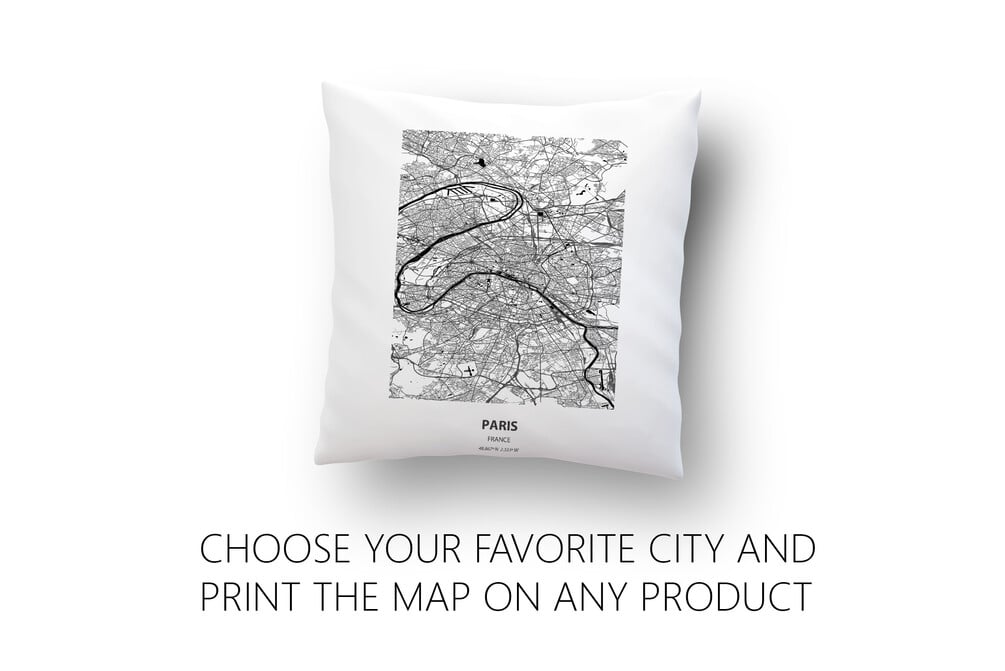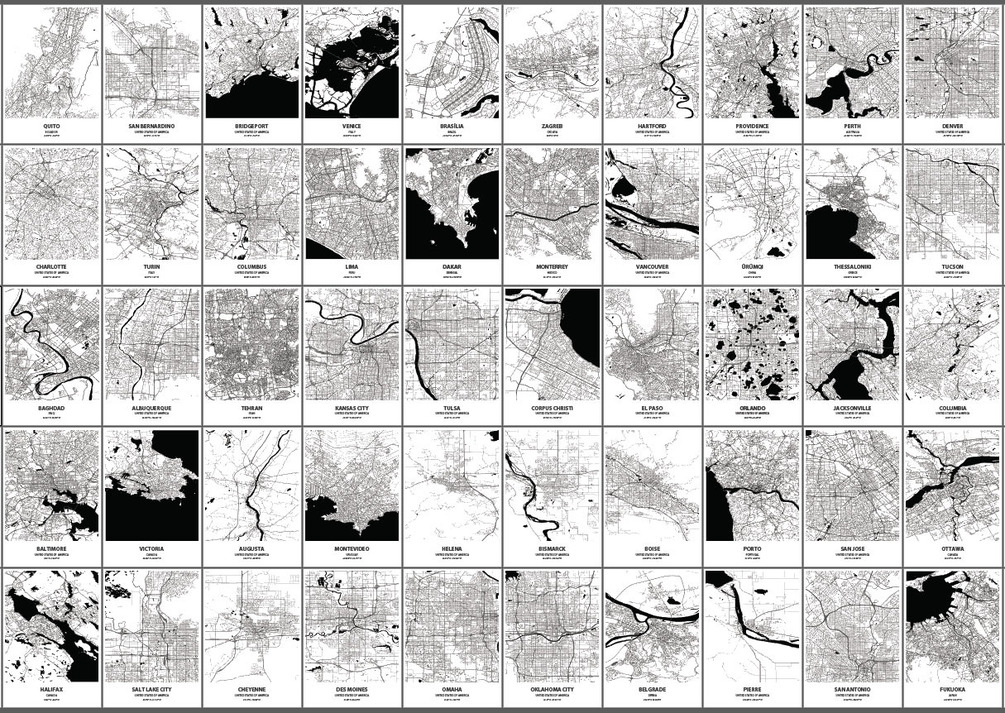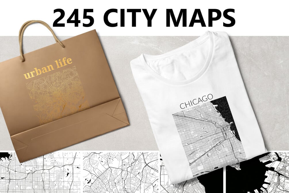 A complete bundle of 245 schematics vector maps of cities around the world, including 87 US and Canada cities. Each map contains the streets and texts with the name of the city, country and location coordinates.