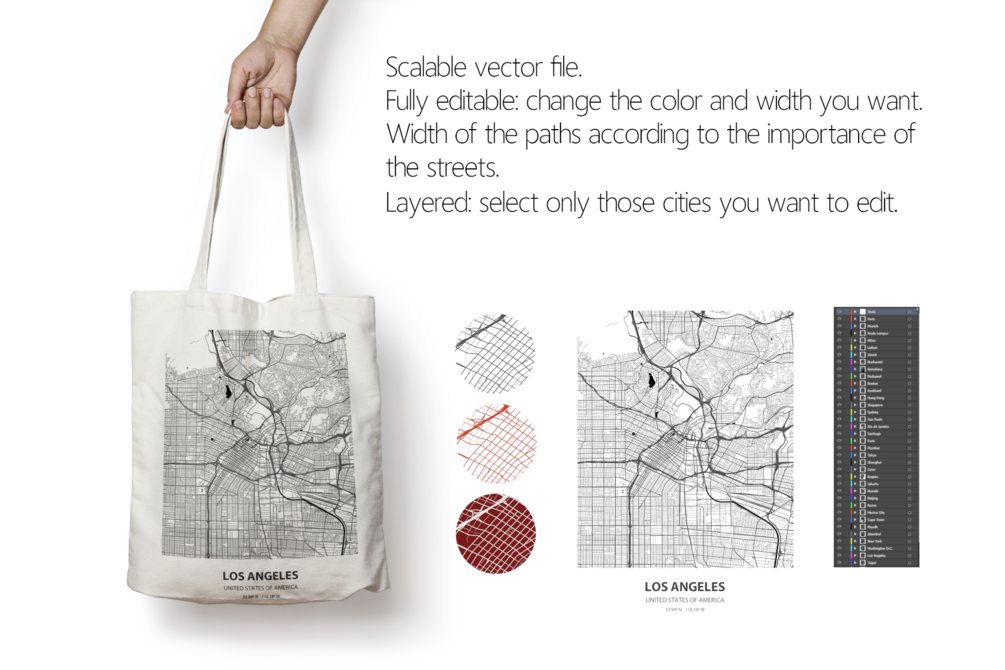 5 Adobe Illustrator (AI) files with all street maps (sorted in cities and megacities). EPS files (fully editable EPS file with all street maps included ). PNG files of all street maps (300 dpi). Instructions for editing the AI file.