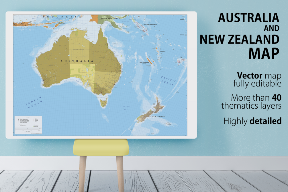 Large scale Australasia political map multi-layered in editable vector format. Highly detailed, ideal for illustrations, prints and multimedia projects. 100% editable including font text for ease of use.