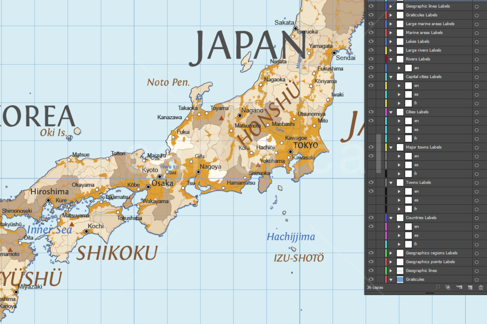All texts can be modified: real text no outlines. The typographies utilized are appropriate for use in mapping, maintaining readability in small spaces and on complex backgrounds of the map. It also utilize a hierarchical correct use of font size. All them are free for personal and commercial use.