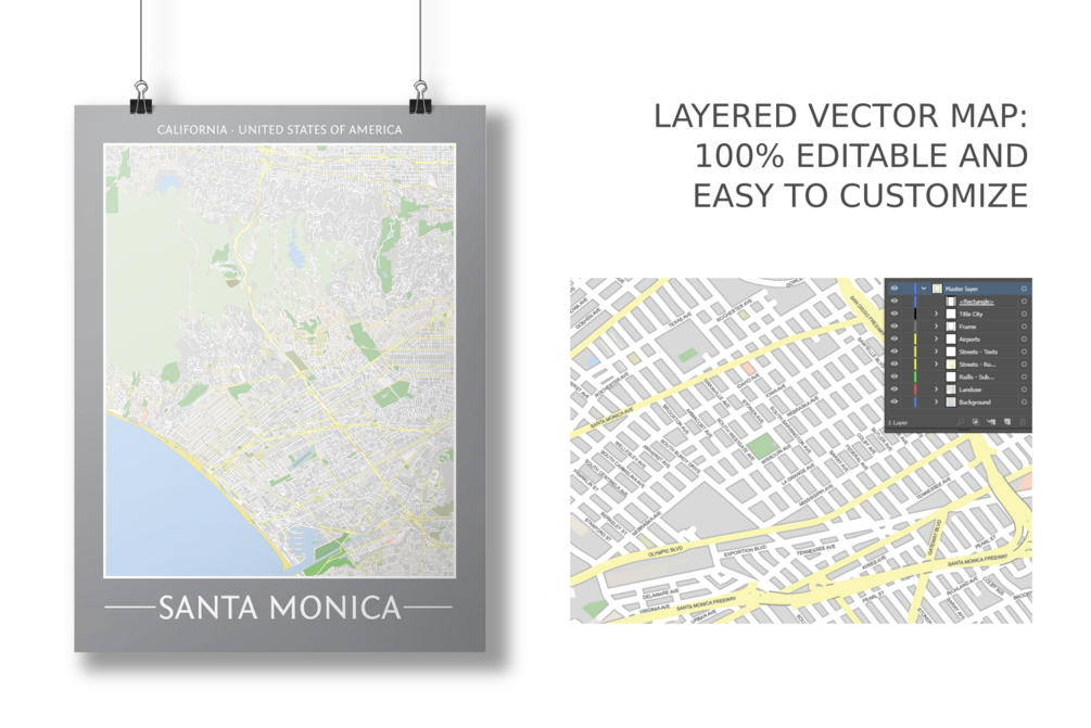 Fully editable layered vector map of Santa Monica - Los Angeles, California. Easy to customize, ideal for illustrations, prints and multimedia projects.