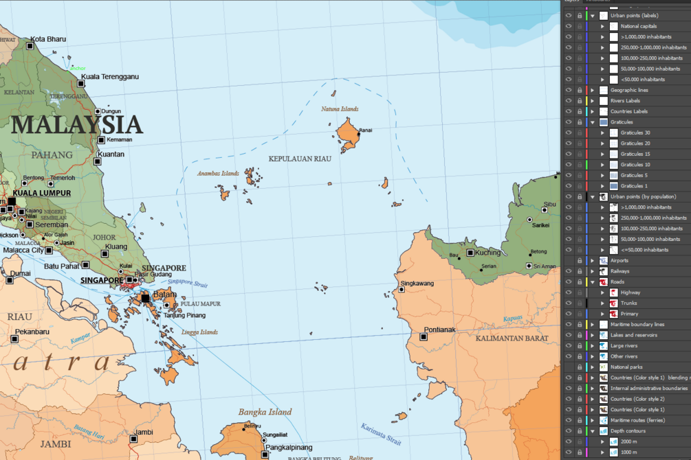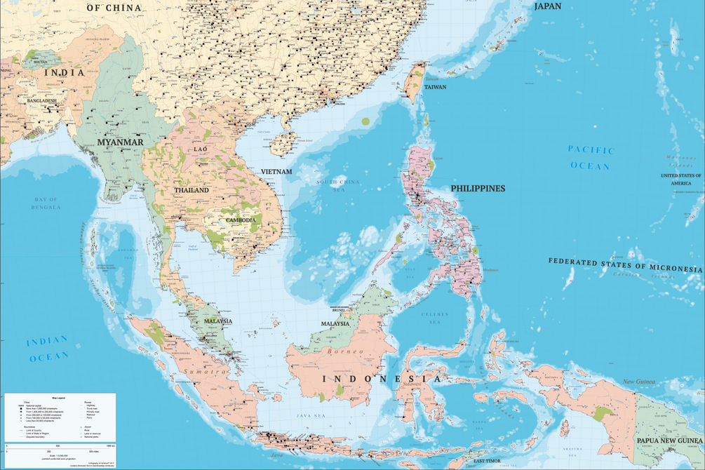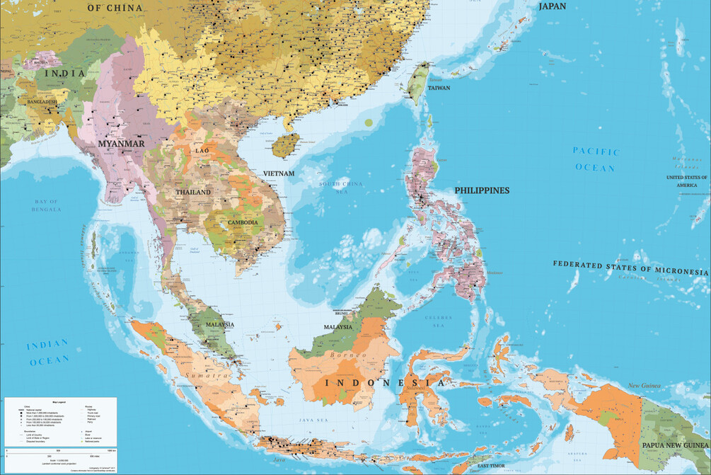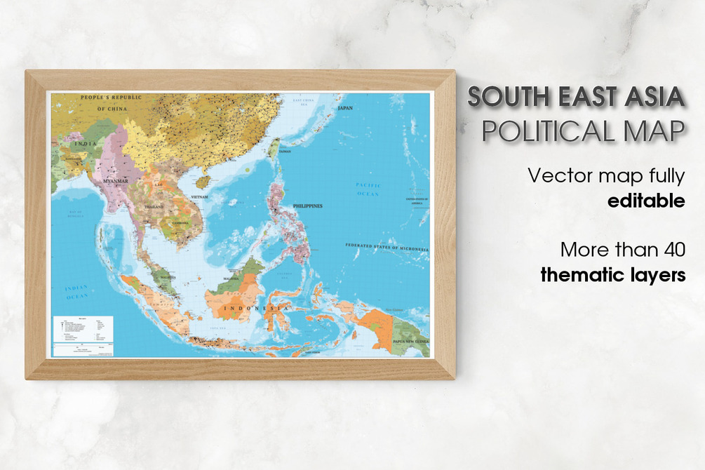 Large scale South East Asia political map multi-layered in editable vector format. Highly detailed, ideal for illustrations, prints and multimedia projects. 100% editable including font text for ease of use.