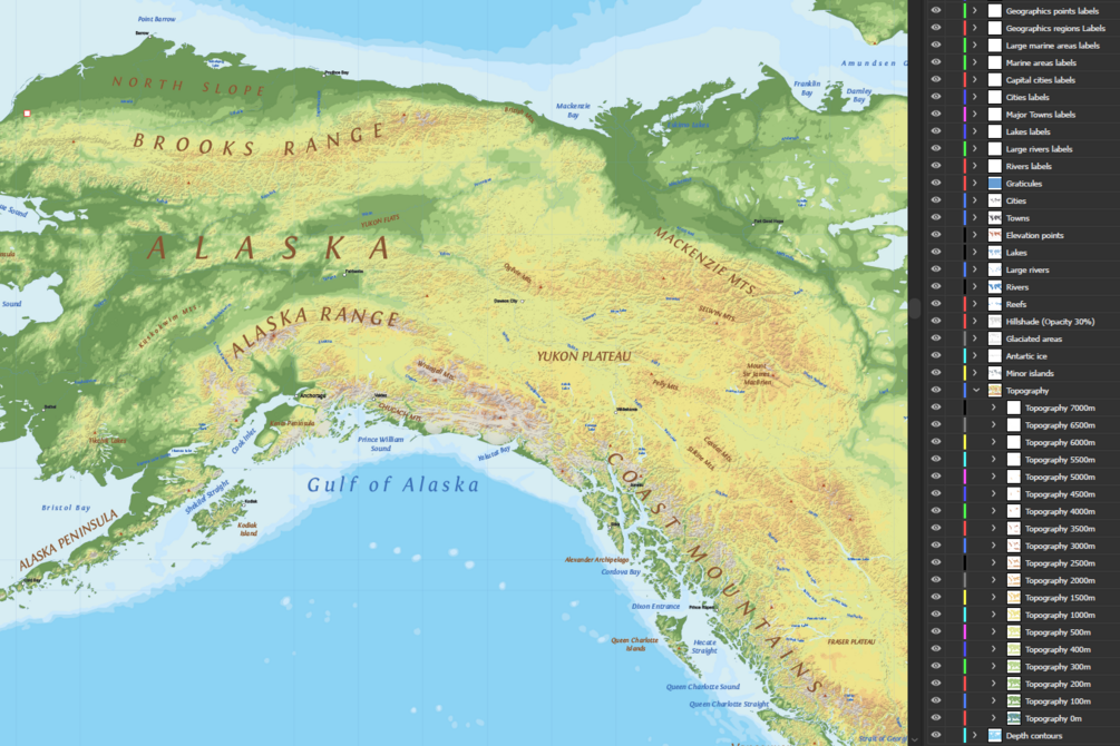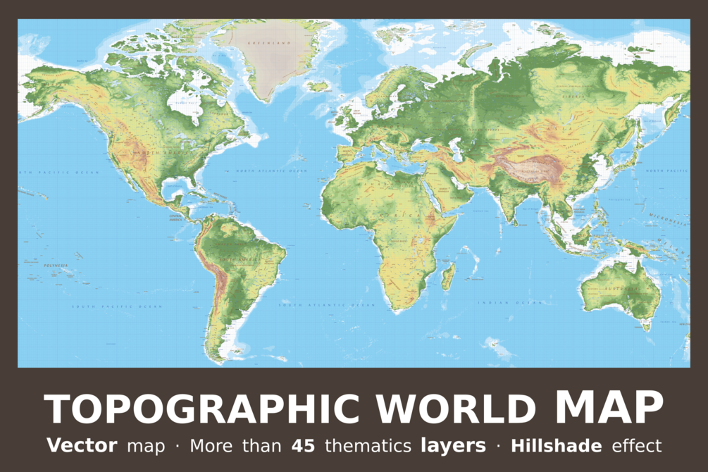 - 46 thematic layers: Elevation contours layers, Shade relief, Minor islands, Antartic ices, Glacited areas, Reefs, Rivers, Large rivers, Lakes, Elevation points, Towns, Cities and Graticule layers.